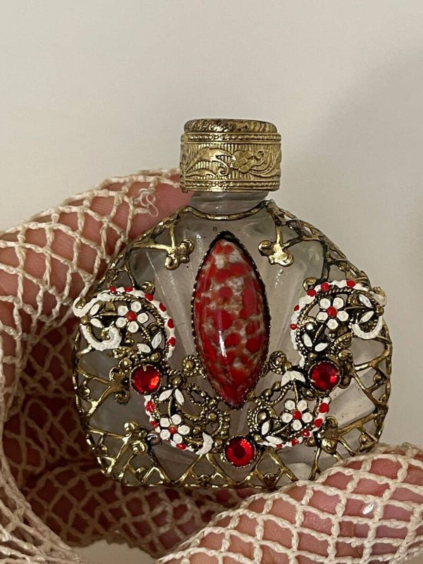 Chaque flacon présente une monture en métal ciselé, ornée de cabochons de verre coloré : rouge profond, cristal clair ou ambre doré. Leurs bouchons vissés, également en métal travaillé, renferment chacun un petit applicateur. Ce style, appelé filigree perfume bottle, est typique de la tradition artisanale bohémienne, notamment influencée par les ateliers de Josef Schmidt, Moser ou encore Irice, qui produisaient ces flacons pour séduire les élégantes d’Europe et d’Amérique.